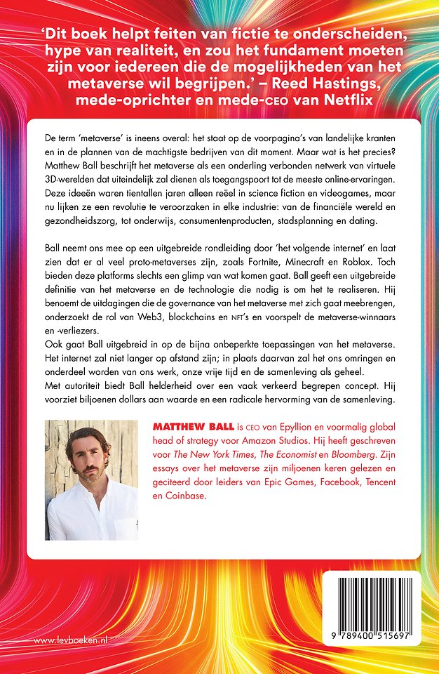 Matthew Ball is CEO van Epyllion Co. en voormalig global head of strategy voor Amazon Studios. Hij heeft geschreven voor The New York Times, The Economist en Bloomberg. Zijn essays over het metaverse zijn miljoenen keren gelezen en geciteerd door leiders van Epic Games, Facebook, Tencent en Coinbase. Ball verdeelt zijn tijd tussen Toronto, New York City en Miami.