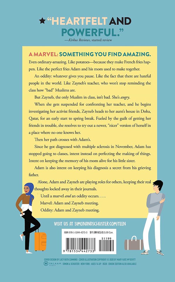 A Today Show Read with Jenna Book Club Pick “The bighearted, wildly charming, painfully real love story I’ve been waiting for.” —Becky Albertalli, New York Times bestselling author of Simon vs. the Homo Sapiens Agenda From William C. Morris Award Finalist S.K. Ali comes a “heartfelt and powerful” (Kirkus Reviews, starred review) romance that’s The Sun Is Also a Star meets Anna and the French Kiss, following two Muslim teens who meet during a spring break trip. A marvel: something you find amazing. Even ordinary-amazing. Like potatoes—because they make French fries happen. Like the perfect fries Adam and his mom used to make together. An oddity: whatever gives you pause. Like the fact that there are hateful people in the world. Like Zayneb’s teacher, who won’t stop reminding the class how “bad” Muslims are. But Zayneb, the only Muslim in class, isn’t bad. She’s angry. When she gets suspended for confronting her teacher, and he begins investigating her activist friends, Zayneb heads to her aunt’s house in Doha, Qatar, for an early start to spring break. Fueled by the guilt of getting her friends in trouble, she resolves to try out a newer, “nicer” version of herself in a place where no one knows her. Then her path crosses with Adam’s. Since he got diagnosed with multiple sclerosis in November, Adam’s stopped going to classes, intent, instead, on perfecting the making of things. Intent on keeping the memory of his mom alive for his little sister. Adam’s also intent on keeping his diagnosis a secret from his grieving father. Alone, Adam and Zayneb are playing roles for others, keeping their real thoughts locked away in their journals. Until a marvel and an oddity occurs… Marvel: Adam and Zayneb meeting. Oddity: Adam and Zayneb meeting.