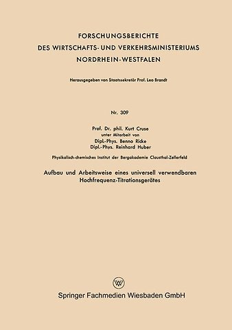 Gliederung.- I. Theorie der Hochfrequenztitration.- II. Problemstellung.- III. Aufbau des Gerätes.- IV. Das Titriergerät.- 1. 35 — MHz — Titrimeter.- 2. 1- und 6-MHz — Titrimeter.- 3. Frequenzmesser.- 4. Differentiator.- 5. Röhrenvoltmeter.- 6. Meßinstrumente und Schreiber.- 7. Energieversorgung.- V. Arbeitsweise des Gerätes.- 1. Bedienungsanweisung.- 2. Verwendete Meßzellen.- 3. Leitfähigkeitskurven.- VI. Anwendungsbeispiele.- VII. Titrationskurven-Bilder.- VIII. Literaturverzeichnis.