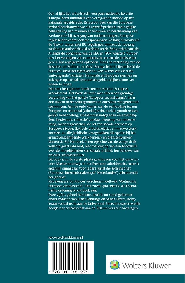 Deze 5e druk van Europees arbeidsrecht is ten opzichte van de vorige druk volledig geactualiseerd, met toevoeging van een hoofdstuk over de mogelijkheden van sociale politiek ten behoeve van precaire arbeidsrelaties. Hiermee vormt de uitgave het meest complete en actuele overzicht van het Europees arbeidsrecht. De titel is in de eerste plaats geschreven voor het universitaire Masteronderwijs in het Europese arbeidsrecht, maar is eigenlijk onmisbaar voor iedere jurist die zich met het (Europese, internationale en/of #Nederlandse#) arbeidsrecht bezighoudt. Het eveneens bij Wolters Kluwer verschenen wetboek, #Wetgeving Europees Arbeidsrecht#, sluit zowel qua selectie als thematische ordening bij dit boek aan.