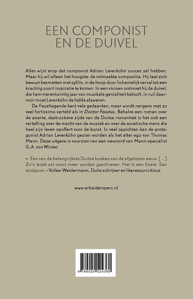 De Faustlegende kent vele gedaanten, maar wordt nergens met zo veel fortissimo verteld als in Doctor Faustus. Behalve een roman over de zwarte, destructieve zijde van de Duitse romantiek is het ook een vertelling over de macht van de muziek en over de ascetische mens die heel zijn leven opoffert voor de kunst. In veel opzichten kan de protagonist Adrian Leverkühn gezien worden als het alter ego van Thomas Mann. Deze uitgave is voorzien van een nawoord van Mann-specialist G.A. von Winter.
