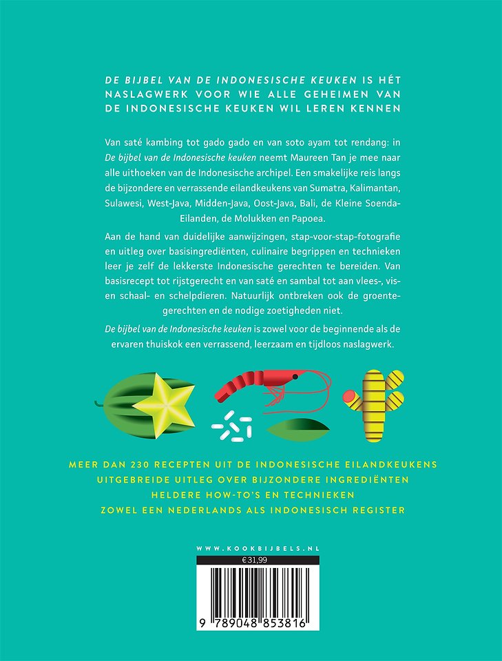 Van saté kambing tot gado gado en van soto ayam tot rendang: in De bijbel van de Indonesische keuken neemt Maureen Tan je mee naar alle uithoeken van de Indonesische archipel. Een smakelijke reis langs de bijzondere en verrassende eilandkeukens van Sumatra, Kalimantan, West-Java, Midden-Java, Oost-Java, Bali, de Kleine Soenda-eilanden, Sulawesi en Papoea.