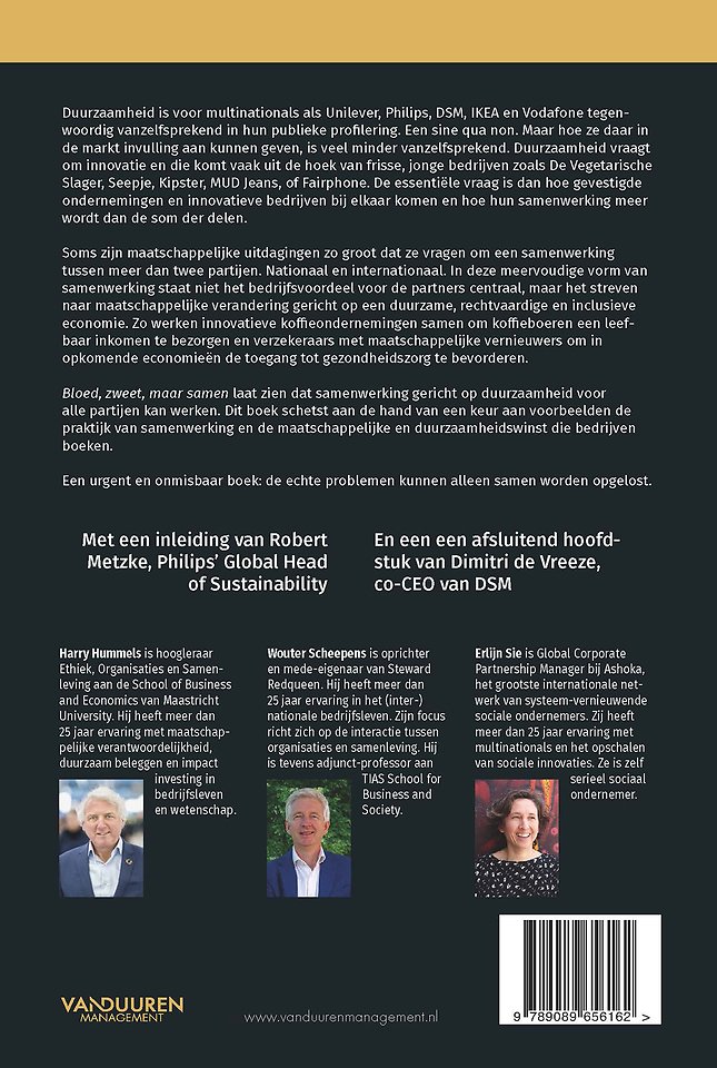 Bloed, zweet, maar samen laat zien dat samenwerking gericht op duurzaamheid voor alle partijen kan werken. Dit boek schetst aan de hand van een keur aan voorbeelden de praktijk van samenwerking en de maatschappelijke en duurzaamheidswinst die bedrijven boeken.