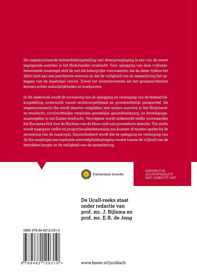 In dit onderzoek wordt de normering van de oplegging en verlenging van de terbeschikkingstelling onderzocht vanuit rechtsvergelijkend en grondrechtelijk perspectief. De ongemaximeerde tbs wordt daartoe vergeleken met andere sancties in het Nederlandse strafrecht, civielrechtelijke verplichte geestelijke gezondheidszorg, en beveiligingsmaatregelen in het Duitse strafrecht. Vervolgens wordt onderzocht welke voorwaarden het Europees Hof voor de Rechten van de Mens stelt aan preventieve detentie. Ten slotte wordt nagegaan welke rol proportionaliteitstoetsing zou kunnen of moeten spelen bij de normering van de maatregel. Geconcludeerd wordt dat de oplegging en verlenging van de tbs-maatregel een expliciete evenredigheidsafweging vereist tussen de vrijheid van de betrokken burger en de veiligheid van de samenleving.