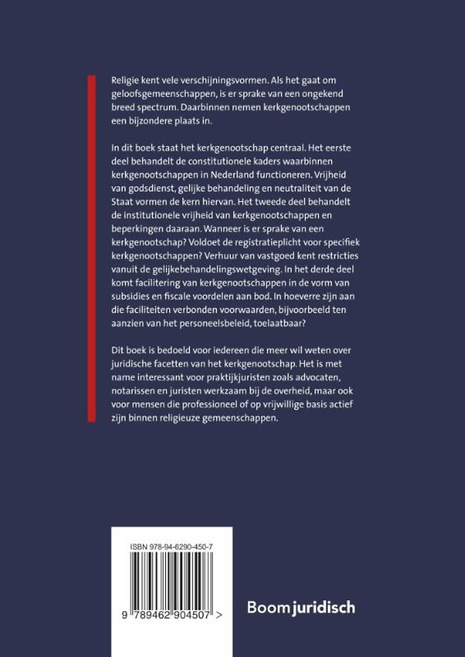 In dit boek staat het kerkgenootschap centraal. Het eerste deel behandelt de constitutionele kaders waarbinnen kerkgenootschappen in Nederland functioneren. Vrijheid van godsdienst, gelijke behandeling en neutraliteit van de Staat vormen de kern hiervan. Het tweede deel behandelt de institutionele vrijheid van kerkgenootschappen en beperkingen daaraan. Wanneer is sprake van een kerkgenootschap? Voldoet de registratieplicht voor specifiek kerkgenootschappen? Verhuur van vastgoed kent restricties vanuit de gelijkebehandelingswetgeving. In het derde deel komt facilitering van kerkgenootschappen in de vorm van subsidies en fiscale voordelen, aan bod. In hoeverre zijn aan die faciliteiten verbonden voorwaarden bijvoorbeeld ten aanzien van het personeelsbeleid, toelaatbaar?
